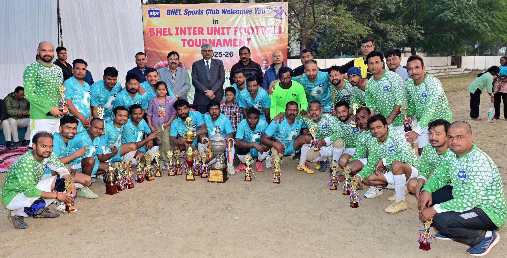 -भेल में आयोजित फु टबाल टूर्नामेंट में पुरस्कार के साथ विजेता टीम।